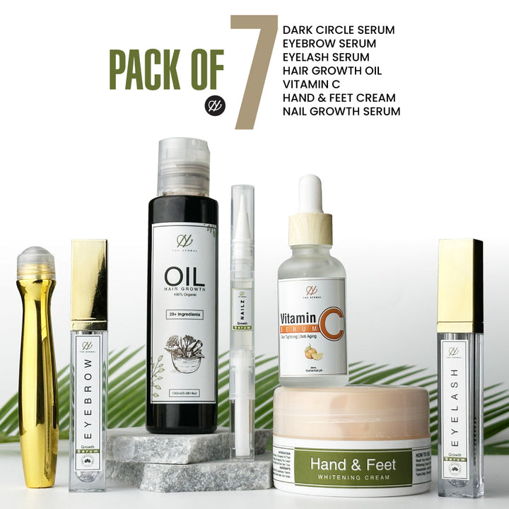 Glow from head to toe with the Lush 7 Kit—a complete self-care bundle designed to enhance your natural beauty with targeted herbal formulas. From longer lashes to radiant skin, strong nails to nourished hair, this all-in-one set delivers visible results using gentle, plant-powered ingredients.